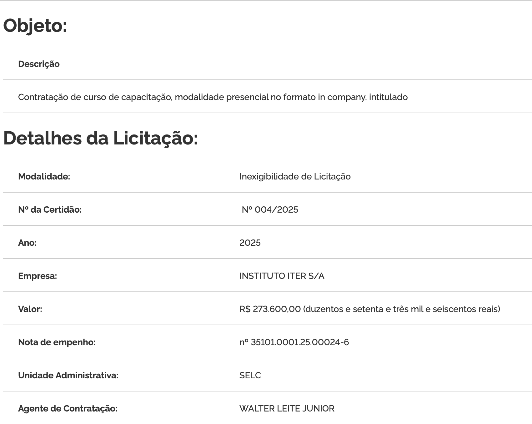 As secretarias estaduais de Educação e Desportos (Seed) e de Licitação e Contratos (Selc) contrataram o Instituto Iter S.A para ministrar curso de capacitação, na modalidade presencial in-company, intitulado “Nova Lei de Licitações e Contatos (Lei 14.133/2021 e Planejamento de Gestões de Obras Públicas”. Valor do contrato: R$ 273.600,00. O Iter, segundo divulgado recentemente pela mídia nacional, seria ligado ao ministro André Mendonça, do Tribunal Superior Eleitoral (TSE), cujo pedido de vistas paralisou o processo de cassação do governador de Roraima, Antonio Denarium (Progressistas).