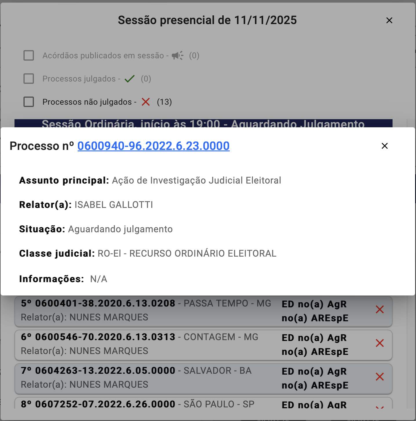 Mendonça poderá anunciar o voto na próxima sessão. Até o momento, há um voto favorável à cassação, o da ministra relatora Isabel Gallotti.